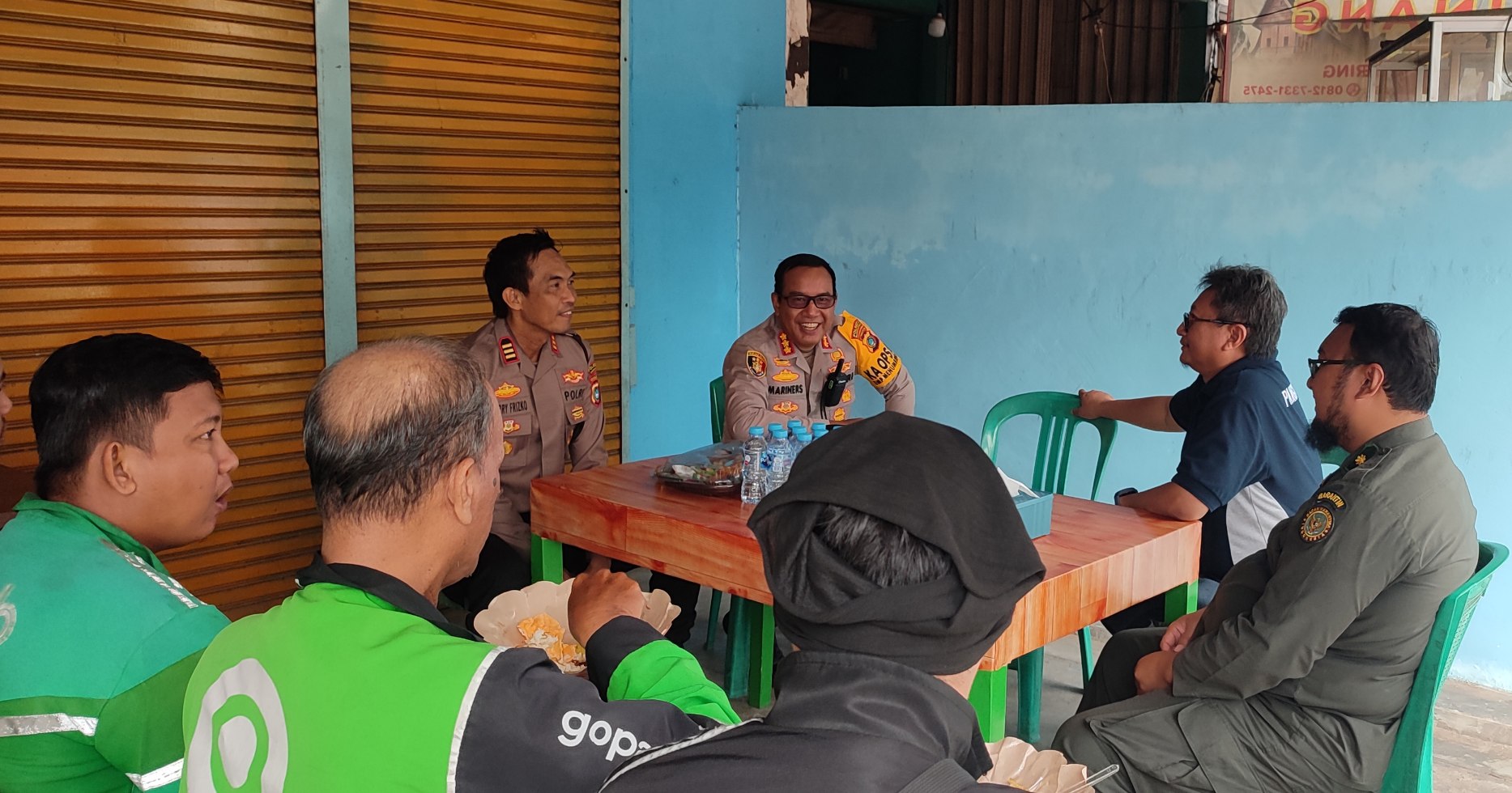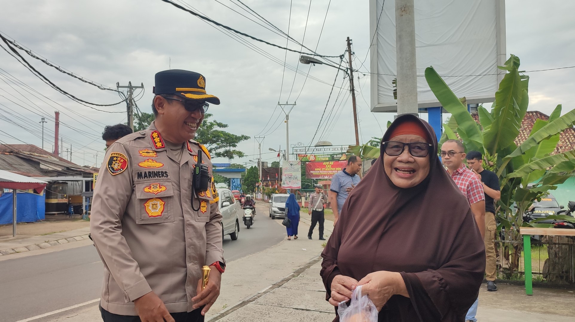 Kombes Pol Max Mariners, didampingi Kapolsek Kawasan Pelabuhan Pangkalbalam AKP Harry Frizko, terlihat menyambut kedatangan masyarakat yang ingin sarapan pagi dan melakukan pemeriksaan kesehatan gratis.