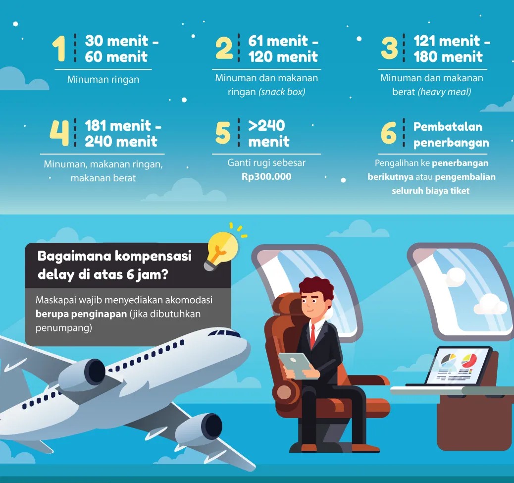 Aturan atau dasar hukum ini tertulis dalam Peraturan Menteri Perhubungan No 89 tahun 2015 tentang keterlambatan penerbangan pada badan usaha angkutan udara niaga berjadwal di Indonesia.