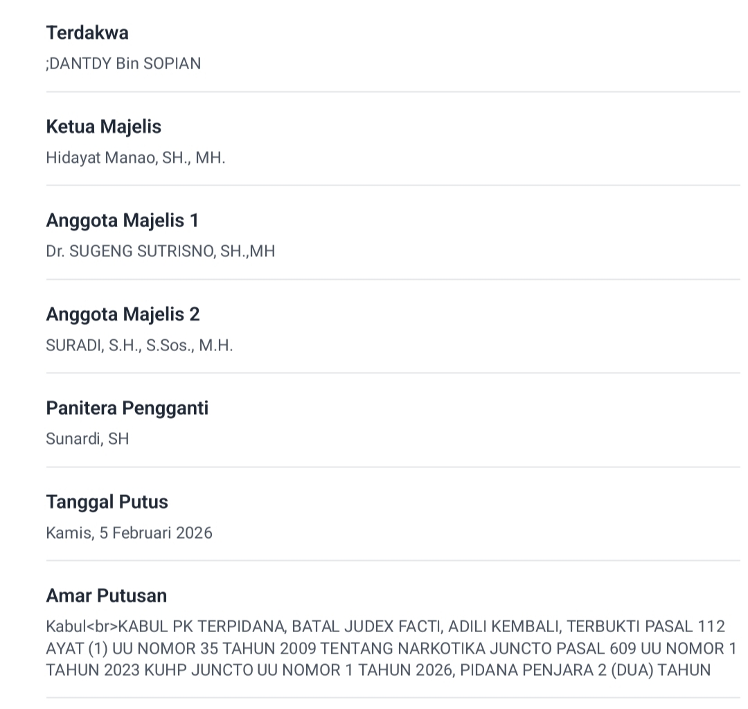 Kabul PK terpidana,batal judex facti, adili kembali, terbukti pasal 112 ayat (1) UU No 35 tahun 2009 tentang narkotika juncto pasal 609 UI No 1 tahun 2023 KUHP Juncto UU No 1 Tahun 2026, pidana penjara 2 dua tahun, dalam amar putusan tersebut